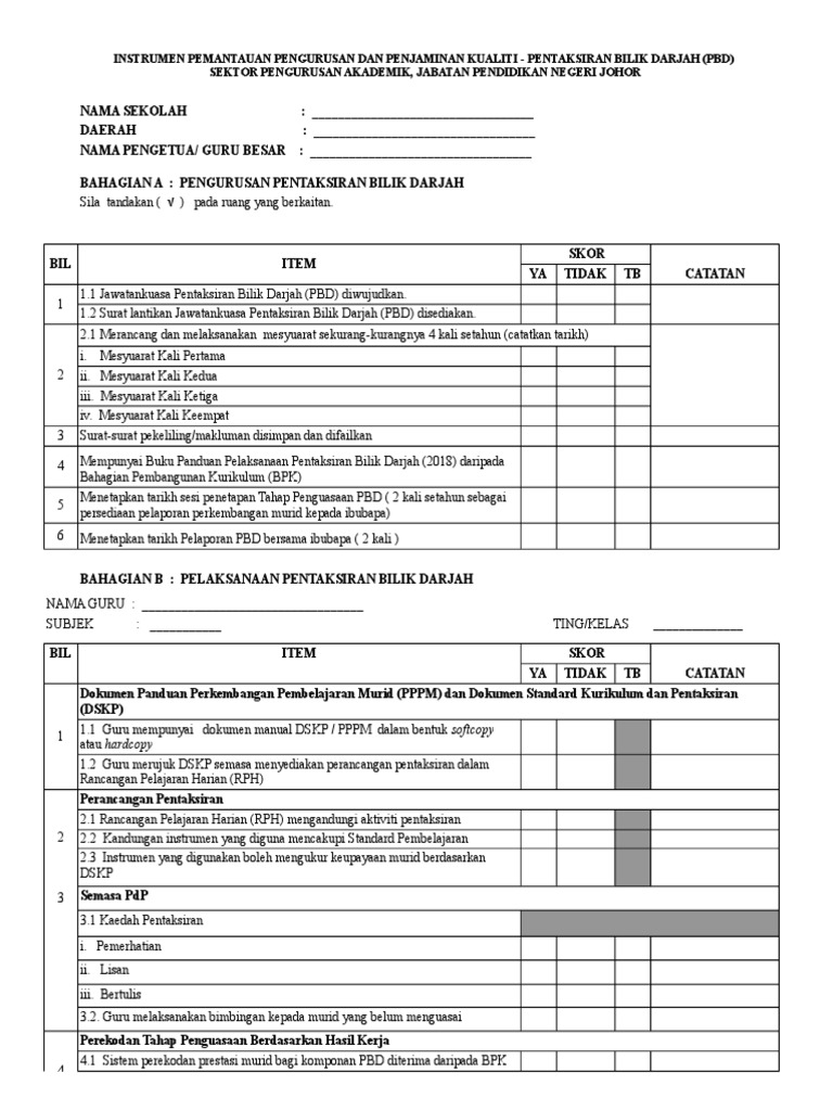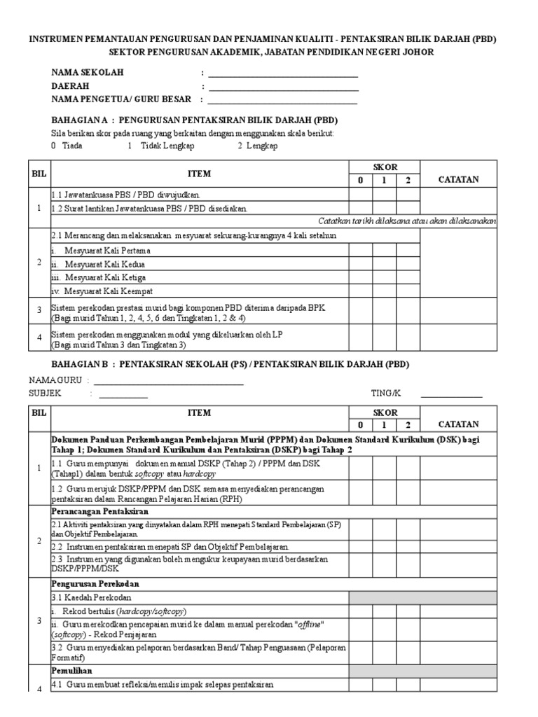 - merancang mengubah suai dan menambah baik kaedah PdPc. Guru-guru kelas dan guru bilik-bilik khas sila gunakan borang ini untuk pengurusan bilik darjah dan. Semoga perkongsian 15 contoh instrumen Pentaksiran Bilik Darjah PBD ini memberikan guru-guru sedikit input berguna mengenai pelaksanaan PBD di sekolah dengan lebih baik.